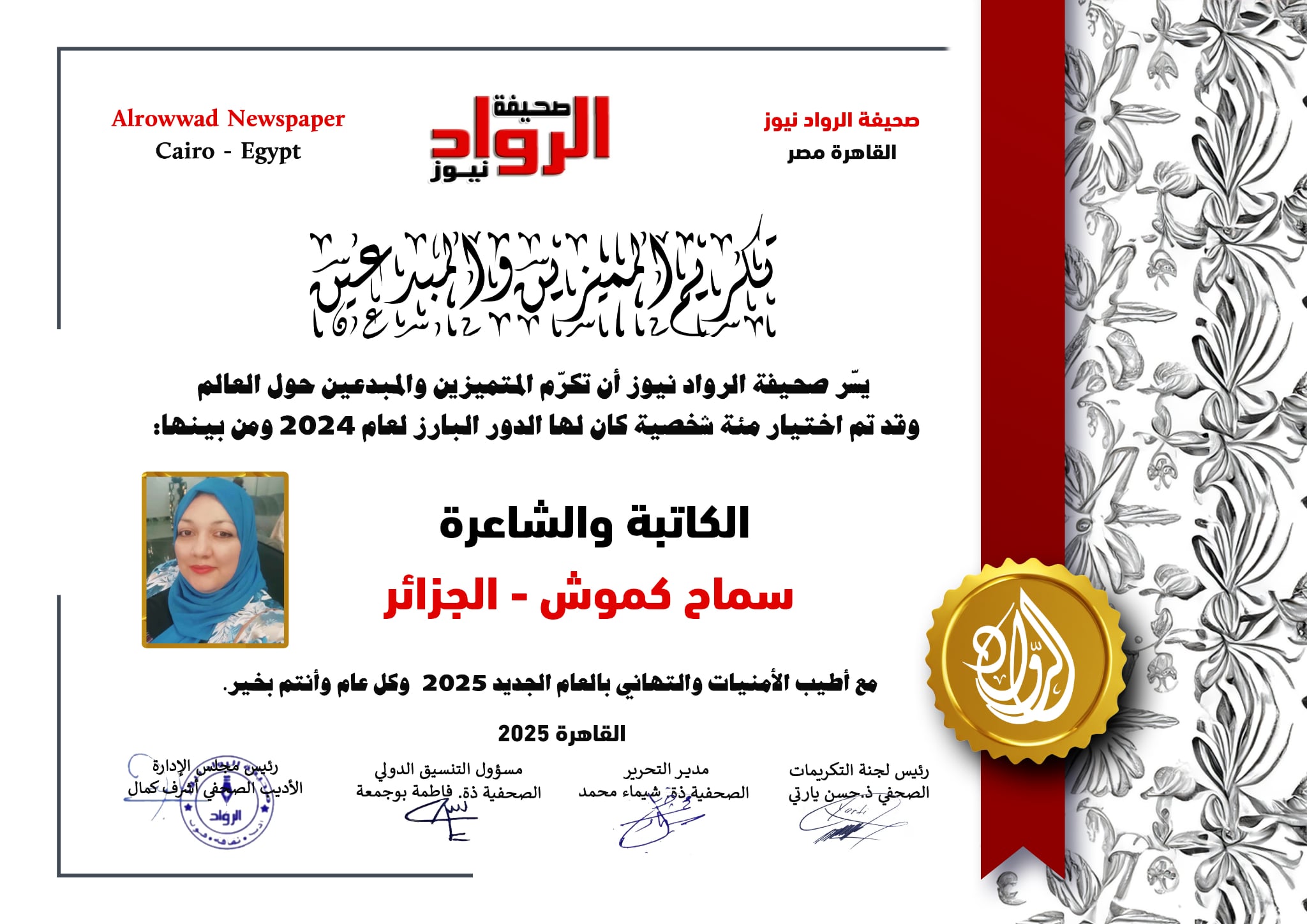 الرّواد نيوز تكرم الكاتبة والشّاعرة سماح كموش من الجزائر الشقيق