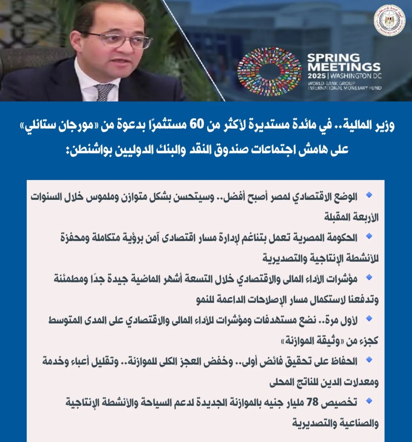 أكد أحمد كجوك، وزير المالية، أن الوضع الاقتصادي لمصر أصبح أفضل، وسيتحسن بشكل متوازن وملموس خلال السنوات الأربعة المقبلة، موضحًا أن الحكومة المصرية تعمل بتناغم لإدارة مسار اقتصادى آمن برؤية متكاملة ومحفزة للأنشطة الإنتاجية والتصديرية، واضاف كجوك، في مائدة مستديرة لأكثر من ٦٠ مستثمرًا بدعوة من مؤسسة «مورجان ستانلي» على هامش اجتماعات صندوق النقد والبنك الدوليين بواشنطن، إن: