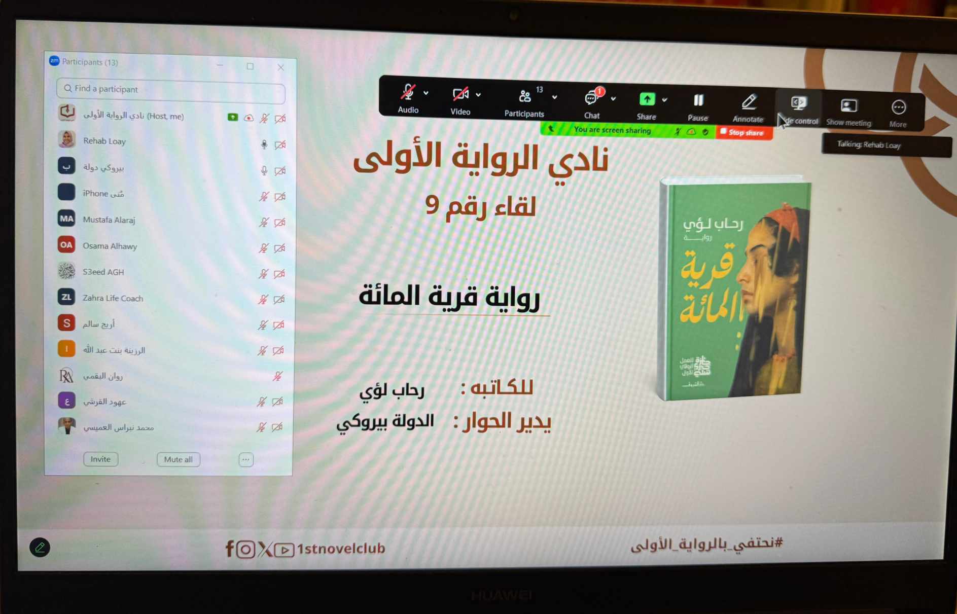 نظم نادي الرواية الأولى، مساء الخميس، جلسته الأدبية التاسعة لمناقشة رواية قرية المائة للكاتبة المصرية رحاب لؤي، وذلك عبر منصة زووم، بحضور نخبة من الأدباء والمهتمين بالأدب الروائي.