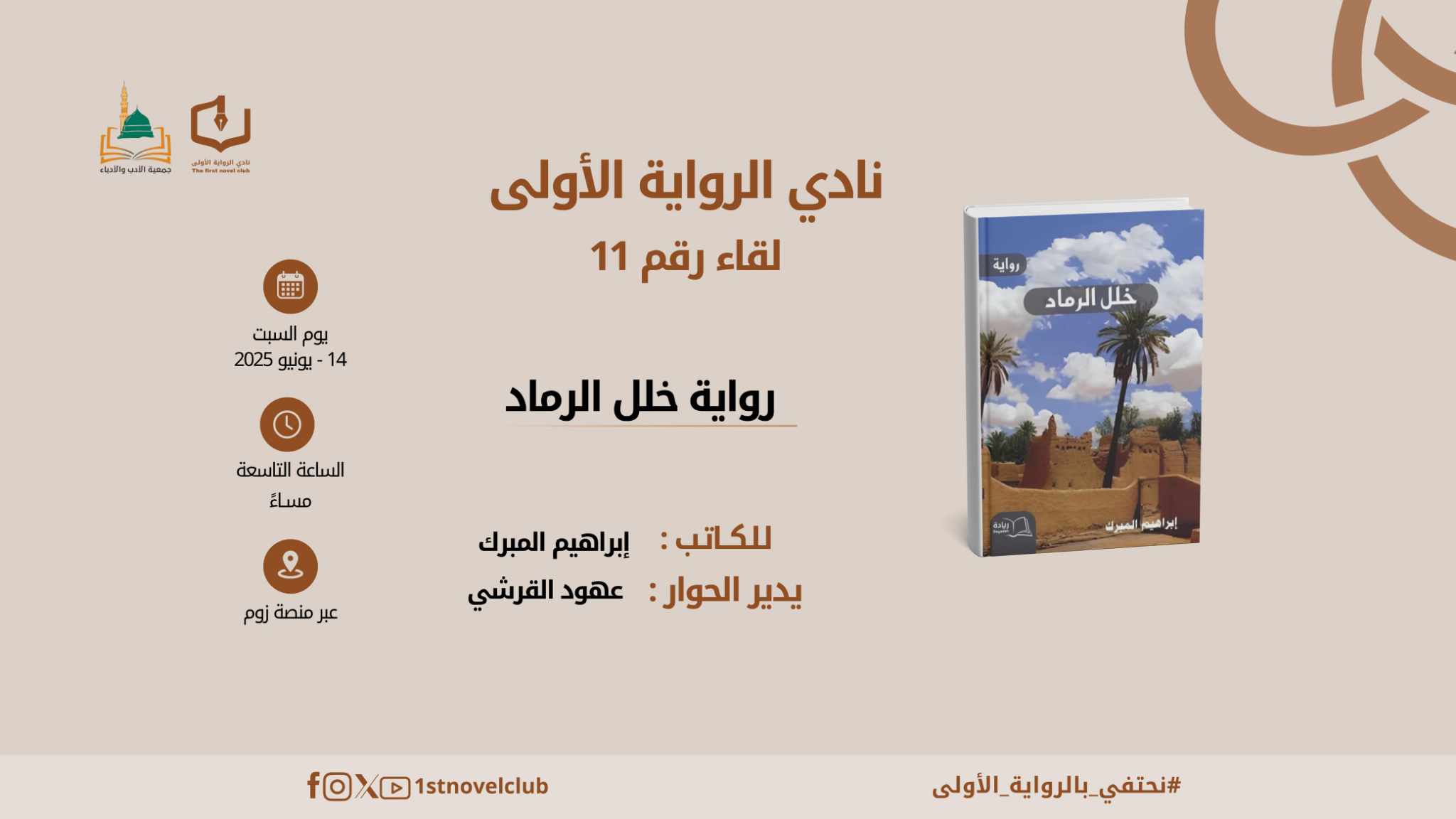 إستضاف نادي الرواية الأولى، مساء السبت 14 يونيو 2025، الكاتب إبراهيم المبرك في أمسية ثقافية عبر منصة “زووم”، خصّصت لمناقشة روايته الأولى “خلل الرماد”، وذلك ضمن اللقاء الحادي عشر من سلسلة فعاليات النادي ، وسط حضور نوعي لعدد من المهتمين بالسرد والرواية …
