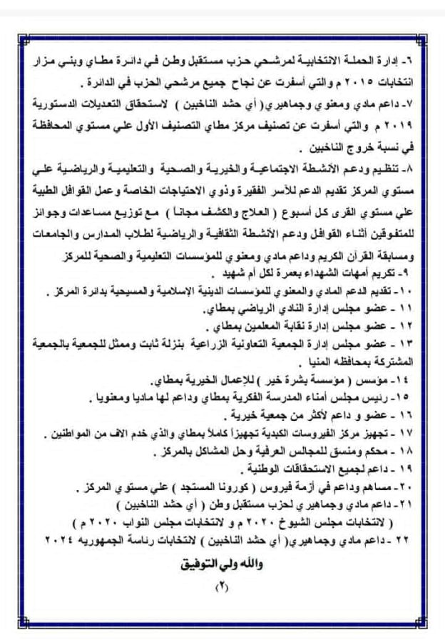_المشاركةَ الفاعلةَ في استحقاقاتِ التعديلاتِ الدستوريةِ 2019م، وكذلك انتخاباتِ مجلسِ الشيوخِ والنوابِ 2020م، والانتخاباتِ الرئاسيةِ 2024م، مع استمرارِ دعمهِ للجماهيرِ والمجتمعِ المحليِّ.