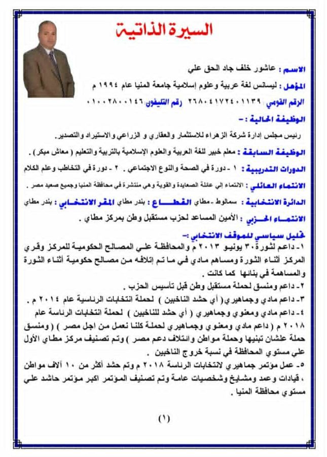 عاشور خلف جاد الحق علي ليس مجردَ مرشحٍ برلمانيٍّ، بل هو نموذجٌ للعملِ الوطنيِّ المتكاملِ، الذي يجمع بين الشرعيةِ المجتمعيةِ، والخبرةِ التنفيذيةِ، والثقةِ السياسيةِ. رجلٌ استطاع عبر سنواتٍ طويلةٍ أن يصنع أثرًا ملموسًا في مجتمعِ مطايٍ وسمالوط ، ليترجم كلّ ذلك الآن إلى رؤيةٍ برلمانيةٍ متكاملةٍ تسعى إلى تحقيق نقلةٍ تنمويةٍ حقيقيةٍ لدائرتهِ، تحت قبةِ البرلمانِ.