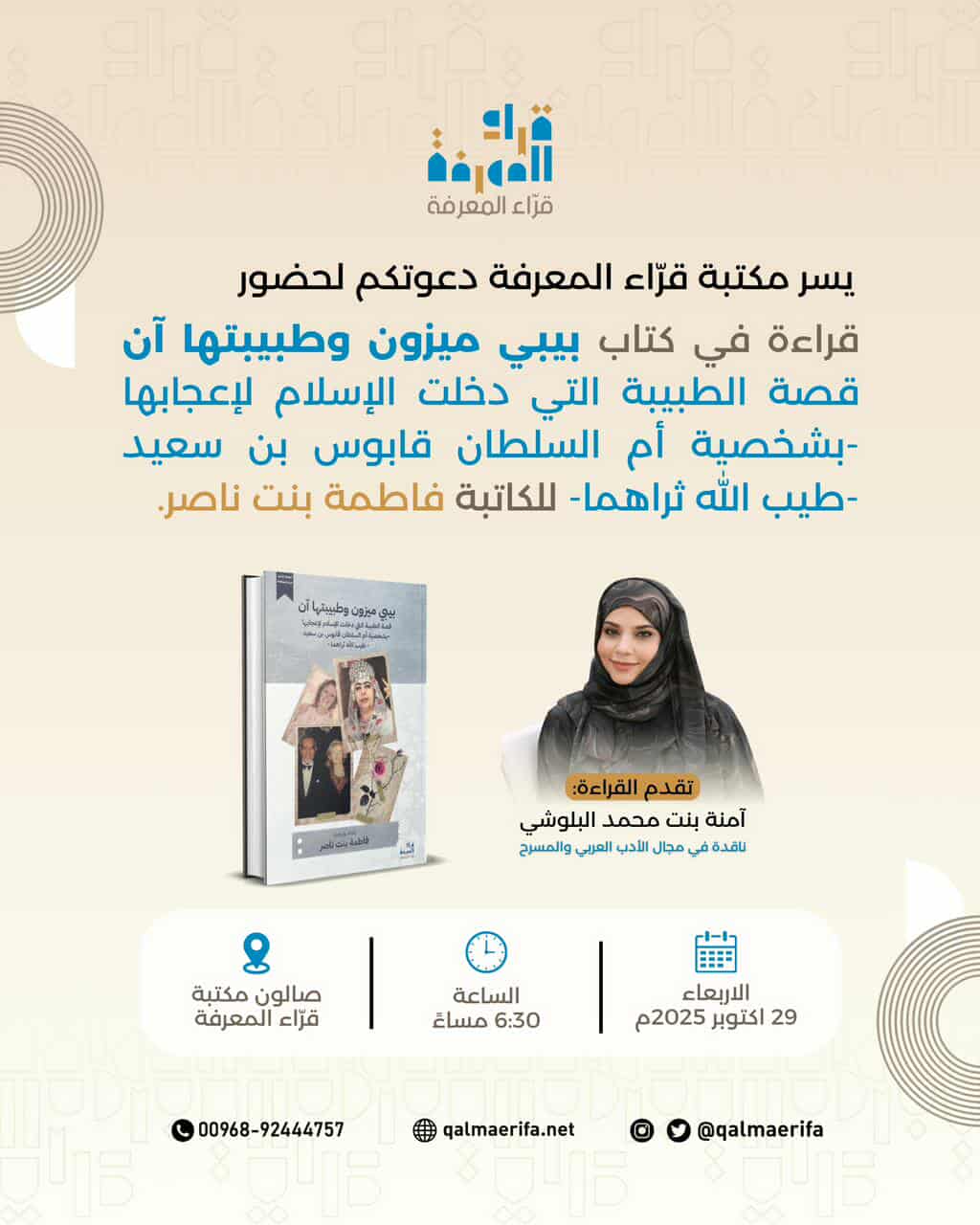تنظم مكتبة قرّاء المعرفة مساء الأربعاء 29 أكتوبر 2025م، عند الساعة السادسة والنصف مساءً، أمسية أدبية بعنوان «قراءة في سيرة الطبيبة آن»، تتناول كتاب «بيبي ميزون وطبيبتها آن – الطبيبة التي دخلت الإسلام لإعجابها بشخصية أمّ السلطان قابوس بن سعيد، طيب الله ثراهما»، من تأليف الكاتبة والمترجمة فاطمة بنت ناصر، وذلك في صالون المكتبة بقرية غلا في ولاية بوشر.