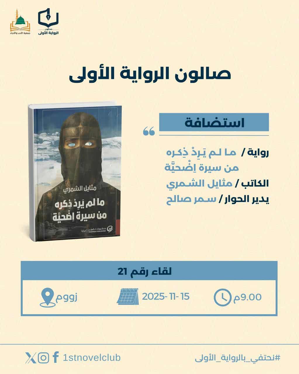 يعلن صالون الرواية الأولى برئاسة الكاتبة عهود القرشي عن تنظيم لقائه الحادي والعشرين مساء يوم السبت 15 نوفمبر الجاري عند الساعة التاسعة مساءً بتوقيت مكة المكرمة، عبر منصة «زووم»، ليستضيف رواية «مالم يُرد ذكره من سيرة أضحية»، وهي العمل الروائي الأول للكاتبة مثايل الشمري.