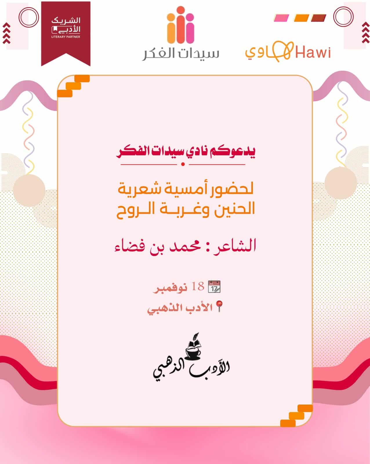 في أمسيةٍ يُنتظر أن تحمل عبق الشعر ودفء الحنين، يلتقي عشّاق القصيدة مع الشاعر محمد فضاء في أمسيةٍ بعنوان «محمد فضاء.. يكتب الحنين على مرافئ الغربة»، وذلك مساء يوم الثلاثاء 18 نوفمبر في مقهى الأدب الذهبي عند الساعة الخامسة والنصف مساءً، ضمن مبادرة الشريك الأدبي التابعة لوزارة الثقافة.