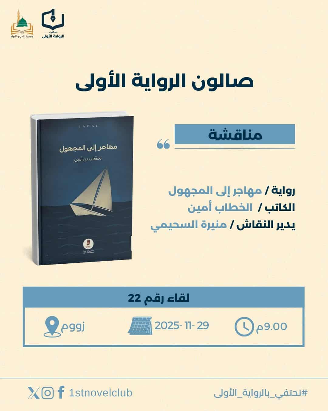 استضاف صالون الرواية الأولى برئاسة الكاتبة عهود القرشي، اللقاء الثاني والعشرين من سلسلة لقاءاته الأدبية، مخصصاً جلسته لمناقشة التجربة الروائية الأولى للكاتب الخطاب أمين، وذلك عبر منصة «زووم»، وسط حضور نوعي من الأدباء والمثقفين والمهتمين بعوالم السرد.