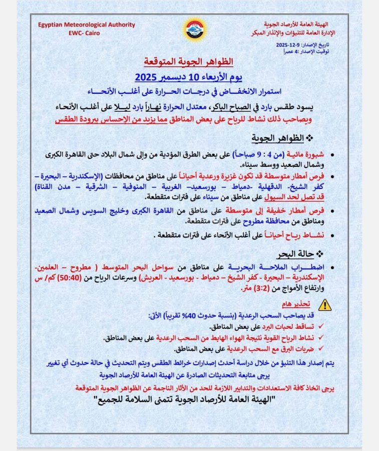 تفاصيل طقس الأربعاء ١٠ ديسمبر