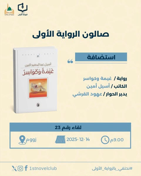 أعلن صالون الرواية الأولى برئاسة الكاتبة عهود القرشي عن تنظيم لقائه الثالث والعشرين مساء الأحد 14 ديسمبر الجاري عند الساعة التاسعة مساءً بتوقيت مكة المكرمة عبر منصة «زووم»، لاستضافة رواية غيمة وكواسر، وهي العمل الروائي الأول للكاتب أسيل أمين
