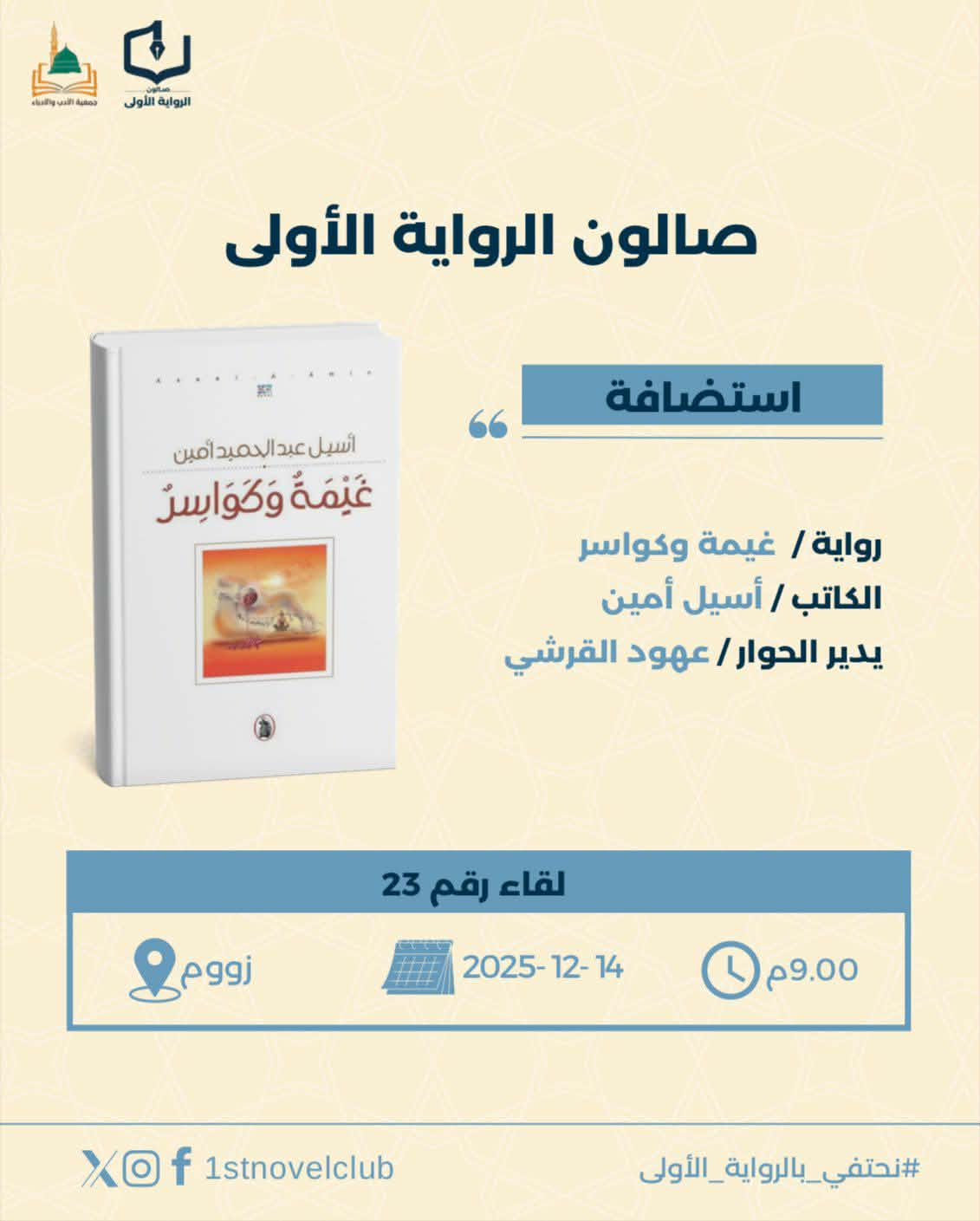 أعلن صالون الرواية الأولى برئاسة الكاتبة عهود القرشي عن تنظيم لقائه الثالث والعشرين مساء الأحد 14 ديسمبر الجاري عند الساعة التاسعة مساءً بتوقيت مكة المكرمة عبر منصة «زووم»، لاستضافة رواية غيمة وكواسر، وهي العمل الروائي الأول للكاتب أسيل أمين
