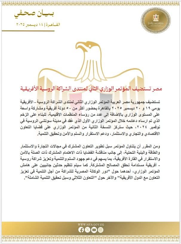 تستضيف جمهورية مصر العربية المؤتمر الوزاري الثاني لمنتدى الشراكة الروسية – الأفريقية يومي ١٩ و ٢٠ ديسمبر ٢٠٢٥ بالقاهرة بحضور أكثر من ٥٠ دولة أفريقية ومشاركة واسعة على المستوى الوزاري بالإضافة إلى عدد من رؤساء المنظمات الإقليمية، للبناء على الزخم الذي تم ارساء دعائمه خلال المؤتمر الوزاري الأول الذي عُقد في مدينة سوتشي الروسية في نوفمبر ٢٠٢٤، حيث ستركز النسخة الثانية من المؤتمر الوزاري على قضايا التعاون الاقتصادي والتجاري والاستثمار، ودعم الاستقرار والسلم والأمن وتحقيق التنمية.