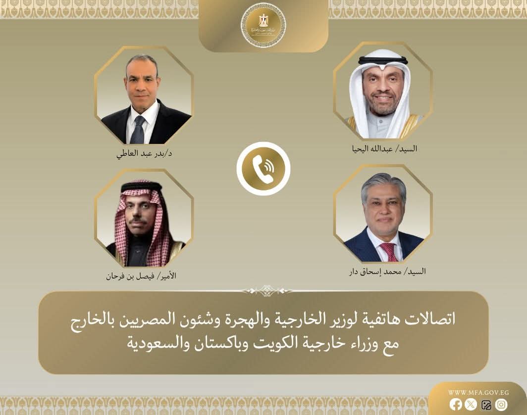 في إطار التنسيق والتشاور المستمر بشأن التطورات الإقليمية، جرت اتصالات هاتفية بين د. بدر عبد العاطي وزير الخارجية والهجرة وشئون المصريين بالخارج وكل من صاحب السمو الأمير فيصل بن فرحان وزير خارجية المملكة العربية السعودية، والسيد عبد الله علي اليحيا وزير خارجية دولة الكويت، والسيد محمد إسحاق دار نائب رئيس الوزراء ووزير الخارجية بجمهورية باكستان الإسلامية، حيث شهدت الاتصالات تبادل وجهات النظر إزاء القضايا الإقليمية ذات الاهتمام المشترك.