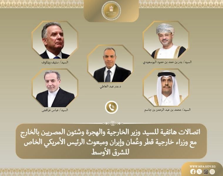 بتوجيهات من الرئيس عبد الفتاح السيسى رئيس الجمهورية، واصل د. بدر عبد العاطى وزير الخارجية والهجرة وشئون المصريين بالخارج اجراء اتصالات مكثفة علي مدار اليومين الأخيرين مع كل من الشيخ محمد بن عبد الرحمن آل ثاني رئيس مجلس الوزراء ووزير خارجية قطر، والسيد بدر بن حمد البوسعيدي وزير خارجية سلطنة عمان، والسيد عباس عراقجي وزير خارجية إيران، بالإضافة إلى السيد ستيف ويتكوف المبعوث الأمريكي الخاص للشرق الأوسط.
