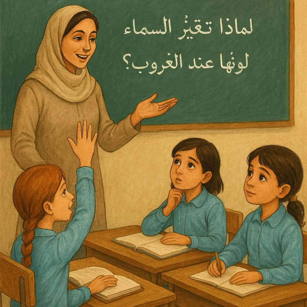 الطالبة النشيطة ترفع يدها بحماس: “لماذا تغيِّر السماءُ لونَها عند الغروب؟