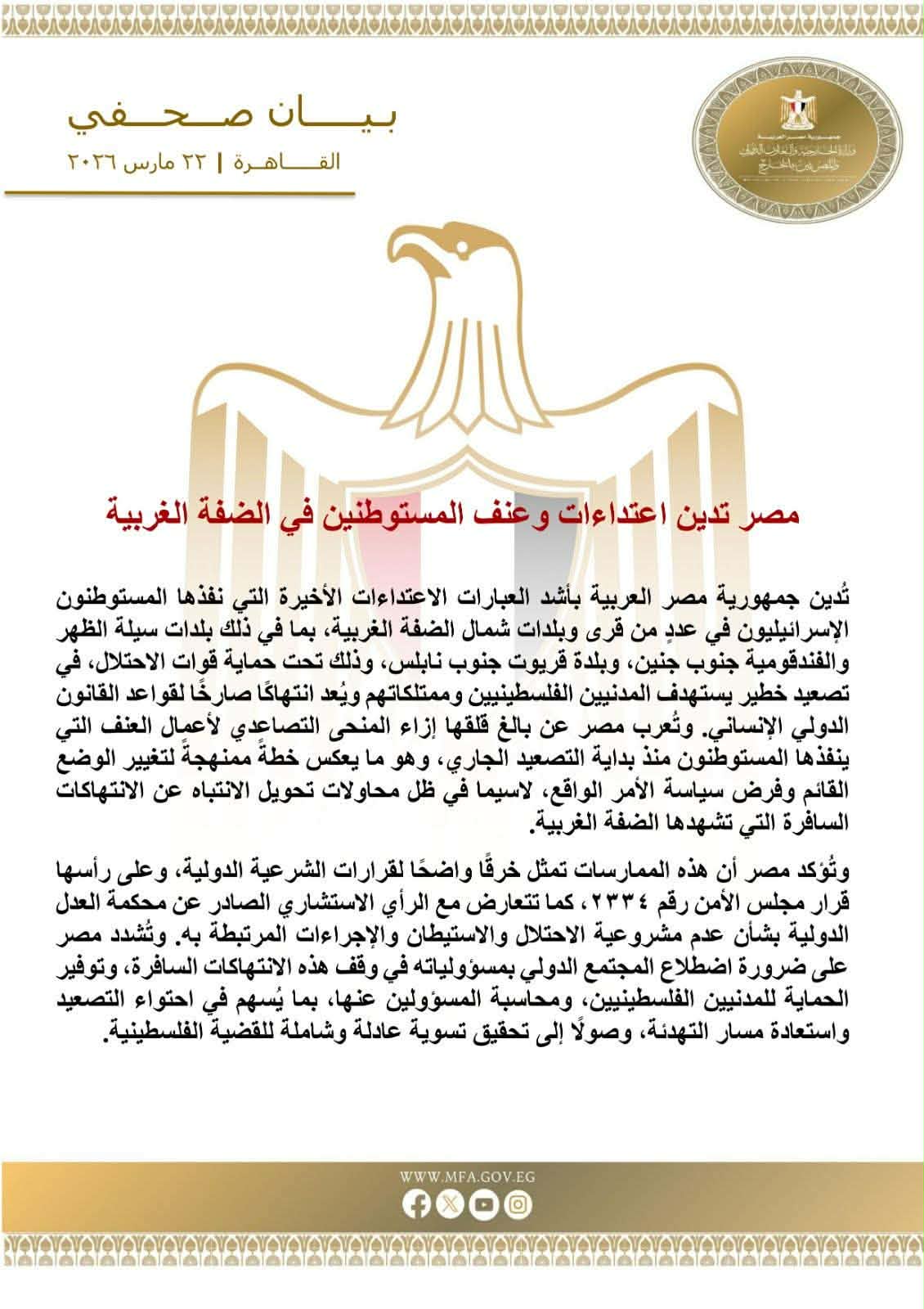 وتُؤكد مصر أن هذه الممارسات تمثل خرقًا واضحًا لقرارات الشرعية الدولية، وعلى رأسها قرار مجلس الأمن رقم ٢٣٣٤، كما تتعارض مع الرأي الاستشاري الصادر عن محكمة العدل الدولية بشأن عدم مشروعية الاحتلال والاستيطان والإجراءات المرتبطة به. وتُشدد مصر على ضرورة اضطلاع المجتمع الدولي بمسؤولياته في وقف هذه الانتهاكات السافرة، وتوفير الحماية للمدنيين الفلسطينيين، ومحاسبة المسؤولين عنها، بما يُسهم في احتواء التصعيد واستعادة مسار التهدئة، وصولًا إلى تحقيق تسوية عادلة وشاملة للقضية الفلسطينية.