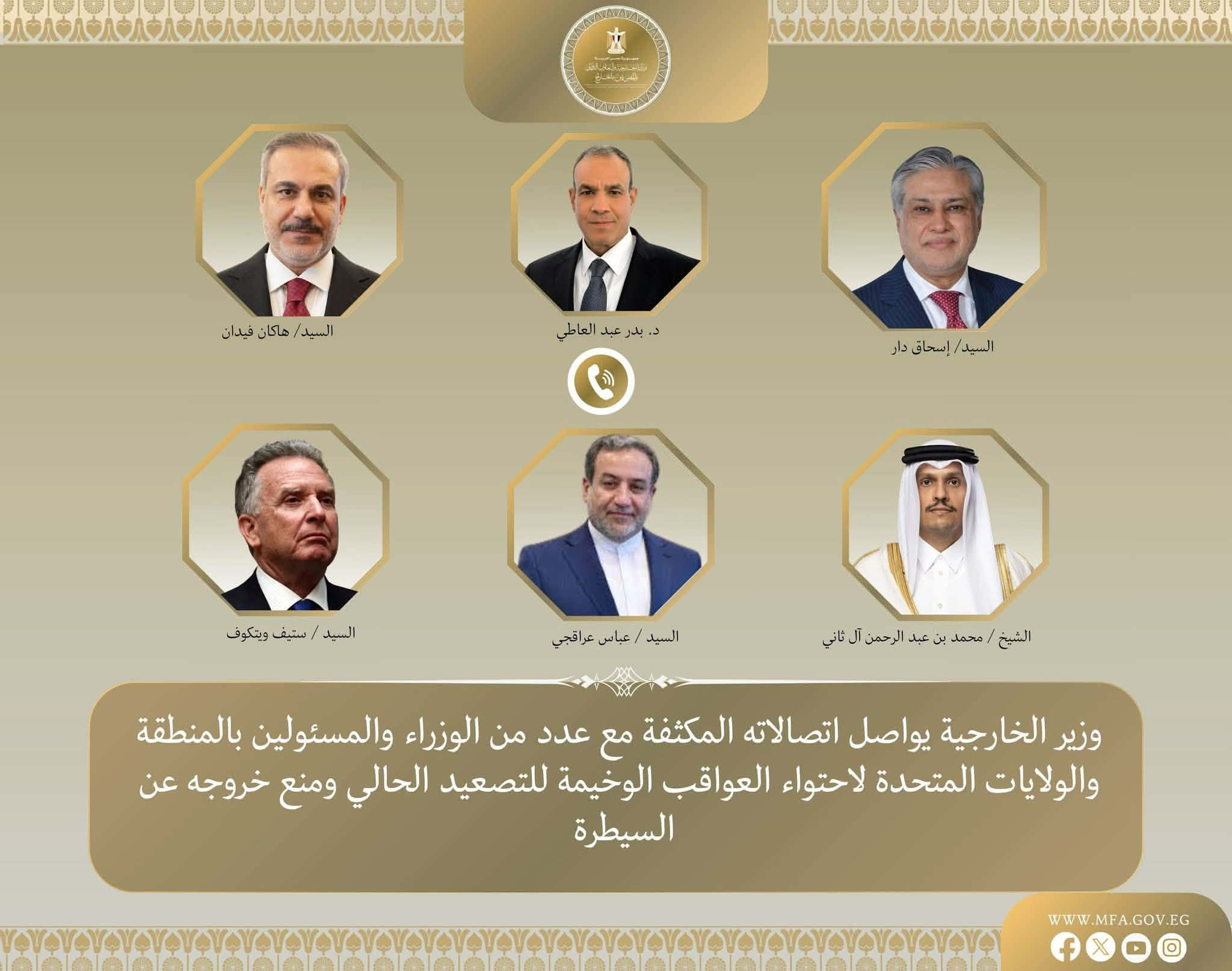 بتوجيهات من فخامة الرئيس عبد الفتاح السيسي وخشية من خروج الأمور في المنطقة عن السيطرة في ظل التصعيد الخطير الحالي، جرت اتصالات هاتفية بين د. بدر عبد العاطى وزير الخارجية والتعاون الدولي والمصريين بالخارج مع كل من السيد إسحاق دار نائب رئيس الوزراء وزير الخارجية الباكستاني، والسيد هاكان فيدان وزير خارجية تركيا، والشيخ محمد بن عبد الرحمن آل ثاني رئيس الوزراء وزير الخارجية القطري، والسيد عباس عراقجي وزير الخارجية الإيرانى، والسيد ستيف ويتكوف المبعوث الأمريكي الخاص للشرق الأوسط، يوم الاحد ٢٢ مارس، وذلك في إطار متابعة التطورات المتلاحقة في المنطقة والمساعي الحثيثة المبذولة من مصر لخفض التصعيد ووقف الحرب.
