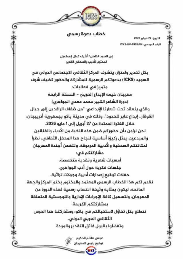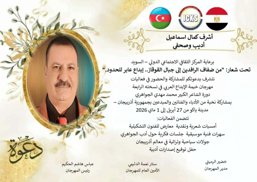 يأتي هذا التمثيل الدولي تحت شعار ملهم: “من ضفاف الرافدين إلى جبال القوقاز.. إبداع عابر للحدود”، حيث يحل أشرف كمال ضيفاً على مدينة باكو بجمهورية أذربيجان في الفترة من 27 أبريل إلى 1 مايو 2026. وتتضمن مشاركته في هذا العرس الثقافي العالمي محاور عدة تعكس ثقله الأدبي، منها: