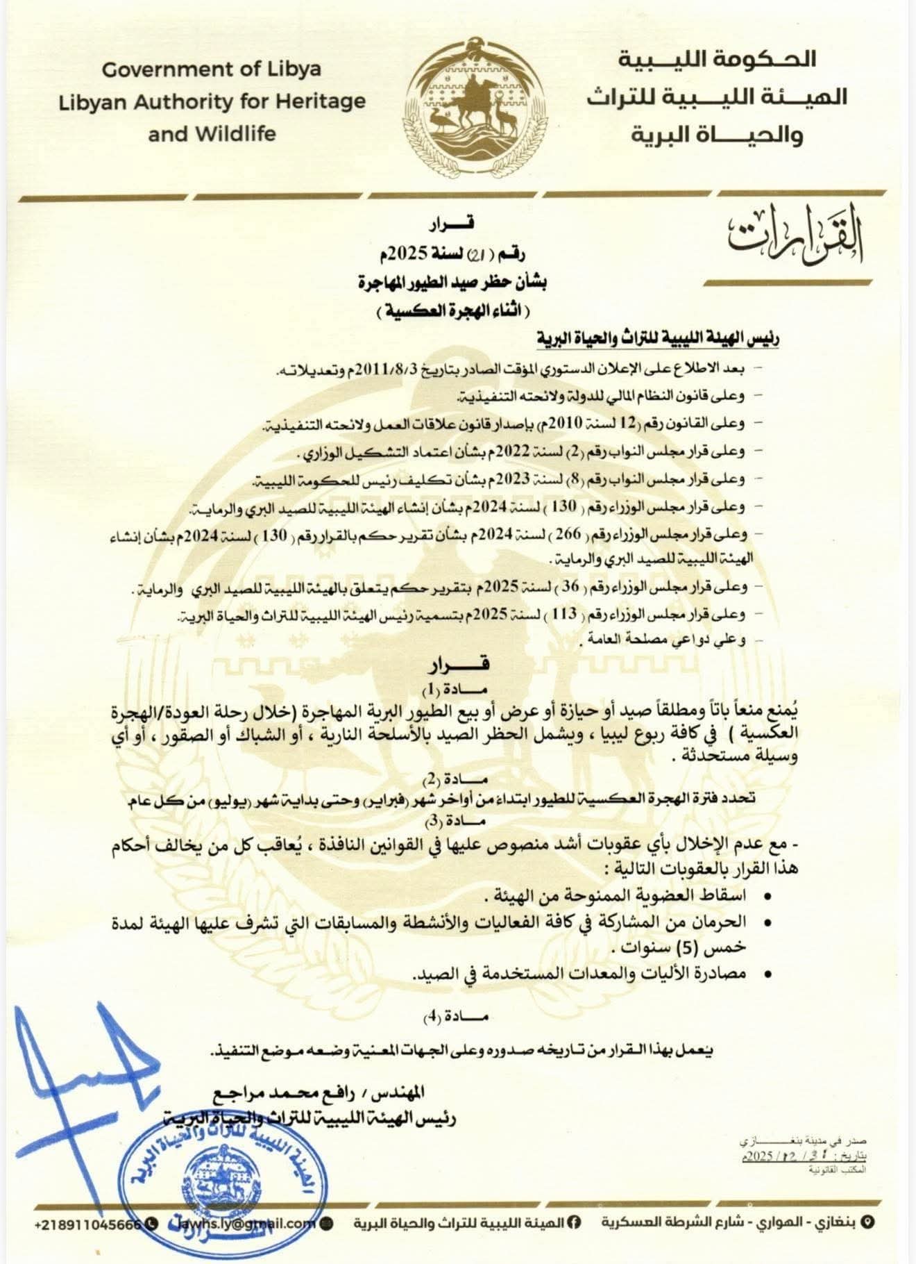 أصدر رئيس الهيئة الليبية للتراث والحياة البرية القرار رقم (21) لسنة 2025 بشأن حظر صيد الطيور المهاجرة خلال فترة الهجرة العكسية في كافة أنحاء ليبيا.