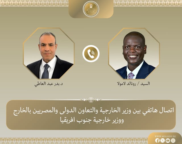 تلقى د. بدر عبد العاطي وزير الخارجية والتعاون الدولي والمصريين بالخارج يوم السبت ١١ أبريل، اتصالاً هاتفياً من السيد رونالد لامولا وزير خارجية جنوب أفريقيا، حيث تناول الاتصال سبل تعزيز العلاقات الثنائية، وكذلك مستجدات الأوضاع فى الشرق الاوسط.