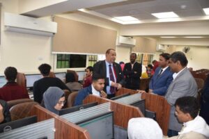 رافق رئيس الجامعة خلال جولته، الدكتور محمود النوبي آدم – عميد كلية الحاسبات والمعلومات، و الدكتور خالد عبد النعيم محمدين – عميد كلية الآثار، والسادة وكلاء الكليات وأعضاء هيئة التدريس .