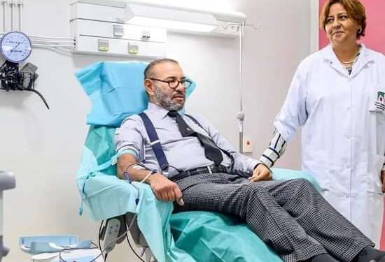 وظهر الملك محمد السادس مستلقياً على سرير المستشفى والخراطيم الطبية تخرج من يده ساحبة عينة التبرع التي ستدخل في أجساد محتاجيها من المصابين.