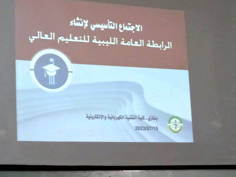 الاجتماع التأسيسي لإنشاء الرابطة العامة الليبية للتعليم العالى عقد بقاعة اجتماعات كلية الهندسة الكهربائية الاجتماع التأسيسي لإنشاء الرابطة العامة الليبية للتعليم العالى ضم اعضاء الهئية الاستشارية للرابطة العامة لأعضاء هيئة التدريس التعليم العالى – ليبيا وذلك مناقشة الرابطة الليبية لأعضاء…