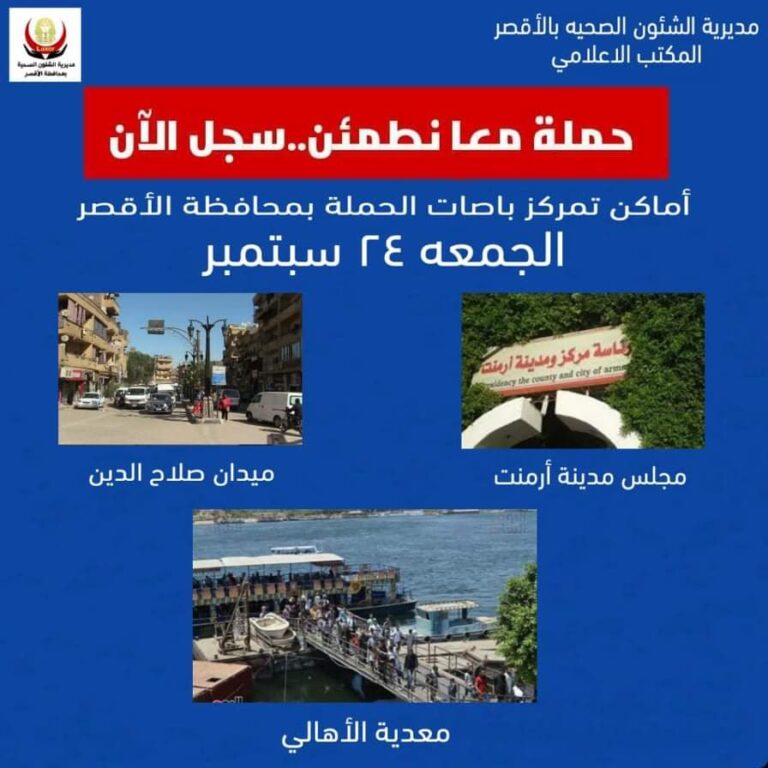 الوحدة المحليه لمركز ومدينة ارمنت تعلن عن بدء فاعليات مبادرة ” معاُ تطمئن… سجل الآن” بمحافظة الاقصر محمد عبدالوهاب أعلنت الوحدة المحلية لمركز ومدينة ارمنت من خلال بدء فعاليات مبادرة “معا_نطمئن..سجل الآن” بمحافظة الأقصر والتي تأتي في إطار…