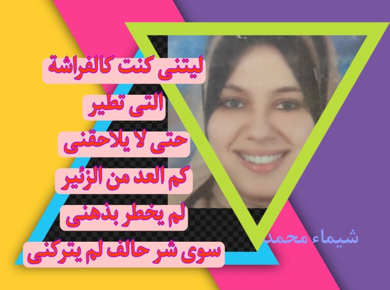 ليتنى كنت كالفراشه التى تطير حتى لا يلاحقنى كم العد من الزئير لم يخطر بذهنى سوى شر حالف لم يتركنى أيقنت أن البشر حولى محبين لم يمنعنى القدر من تغير ما يحلو لى إنى غارقه فى بحر الغدر من حولى…