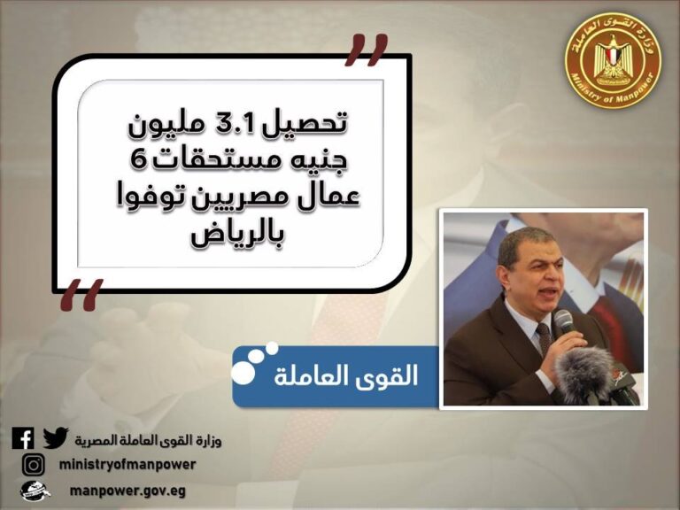 القوي العاملة المصرية …. تحصيل 3.1 مليون جنيه مستحقات 6 عمال مصريين توفوا بالسعودية كتب : أشرف كمال أعلن محمد سعفان، وزير القوى العاملة المصرية ، نجاح مكتب التمثيل العمالي التابع لوزارة القوى العاملة، بالقنصلية العامة المصرية بالعاصمة الرياض بالمملكة…