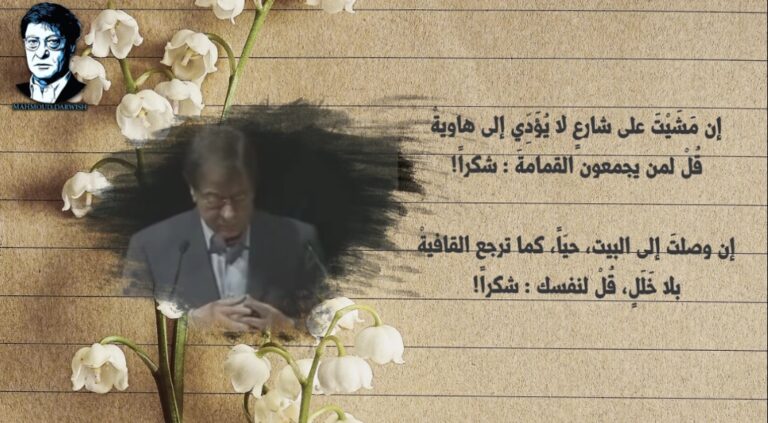 الأديب والشاعر الكبير محمود درويش إن مَشَيْتَ على شارعٍ لا يُؤَدِّي إلى هاويةْ قُلْ لمن يجمعون القمامةَ : شكراً! إن وصلتَ إلى البيت، حيّاً، كما ترجع القافيةْ بلا خَلَلٍ، قُلْ لنفسك : شكراً! إن توقَّعْتَ شيئاً وخانك حَدْسُك, فاذهبْ غداً…