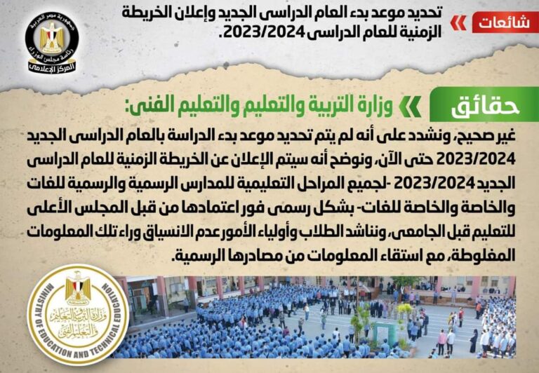 كتب … أشرف كمال شائعة: تداولت بعض وسائل الإعلام والمواقع الإلكترونية وصفحات التواصل الاجتماعي أنباء بشأن تحديد موعد بدء العام الدراسي الجديد وإعلان الخريطة الزمنية للعام الدراسي 2023/2024، وقد قام المركز الإعلامي لمجلس الوزراء بالتواصل مع وزارة التربية والتعليم…