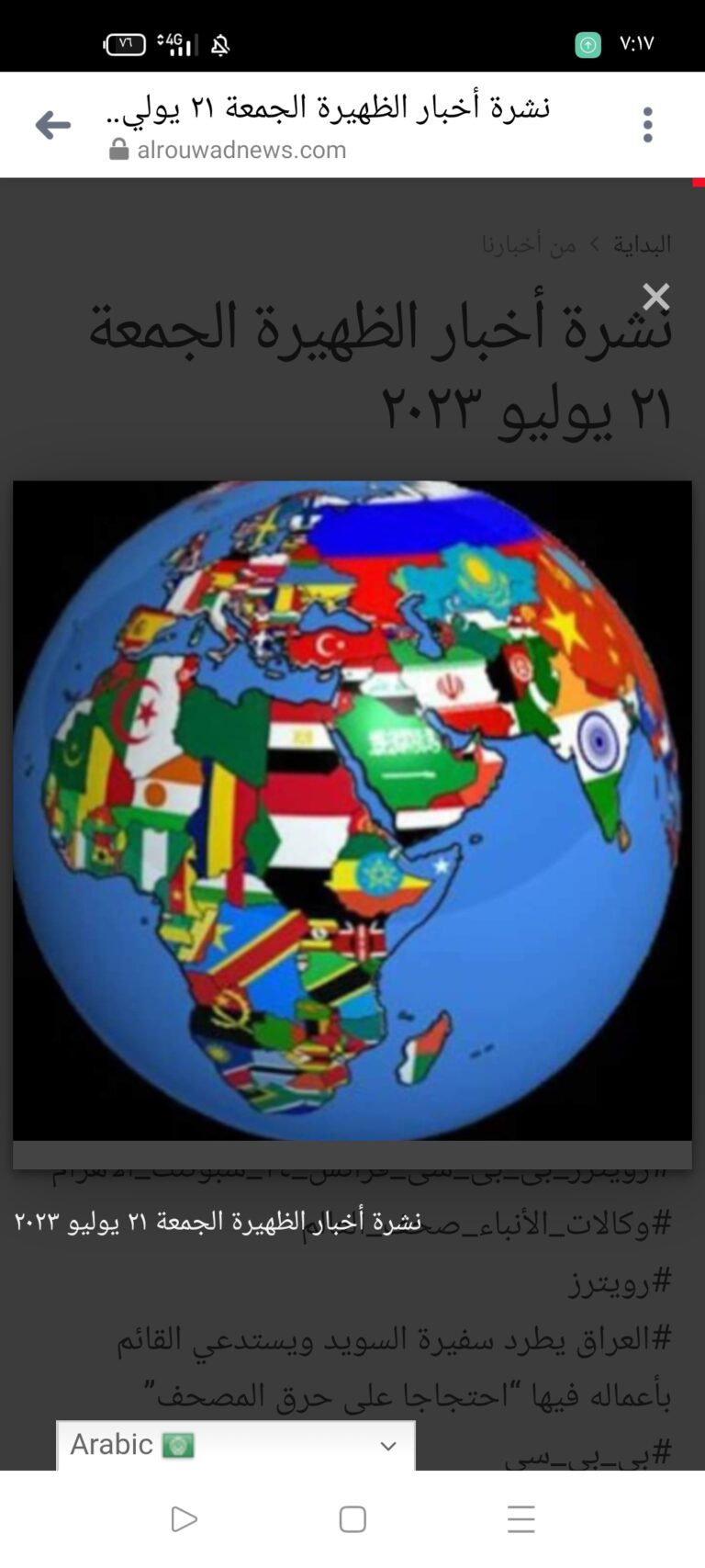 نشرة أخبار الظهيرة الجمعة ٢١ يوليو ٢٠٢٣ #رويترز_بى_بى_سى_فرانس_٢٤_سبوتنك_الأهرام #وكالات_الأنباء_صحف_العالم #رويترز #العراق يطرد سفيرة السويد ويستدعي القائم بأعماله فيها “احتجاجا على حرق المصحف” #بى_بى_سى #ارتفاع حاد فى أسعار الحبوب بأوروبا.. والقمح الأمريكى يسجل أعلى ارتفاع يومى #جارديان #موجات الحر المتكررة تهدد…