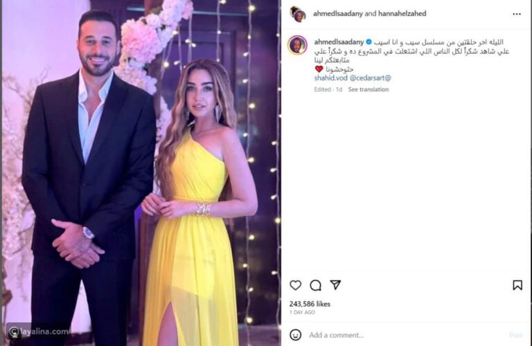 صحيفه الرواد نيوز … نشر الفنان المصري أحمد السعدني عبر حسابه على موقع تبادل الصور والمقاطع المُصوّرة، إنستغرام، أمس، صورة تجمعه بمواطنته الفنانة هنا الزاهد، وأرفقها بتعليق قال خلاله: “الليلة آخر حلقتين من سيب وأنا أسيب، شكرًا لكل الناس…