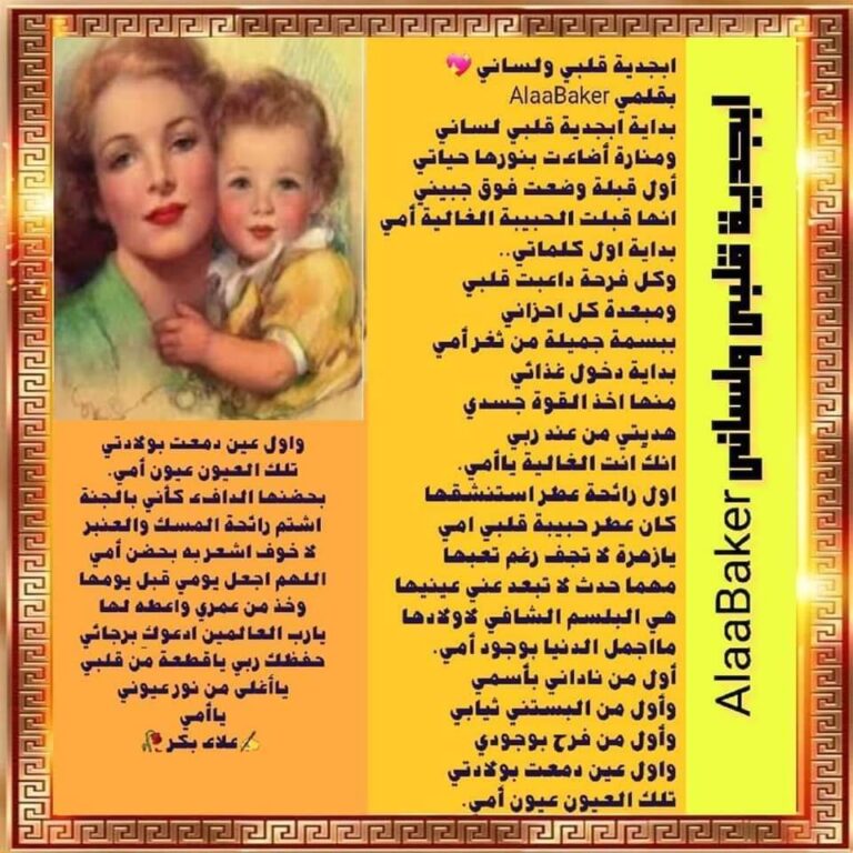 بقلم الشاعر … علاء بكر ابجديتي قلبي ولساني … بداية ابجديتي ولساني ومنارة أضاءت بنورها حياتي أول قبلة وضعت فوق جبيني انها قبلت الحبيبة الغالية أمي بداية اول كلماتي.. وكل فرحة داعبت قلبي ومبعدة كل احزاني ببسمة جميلة من…