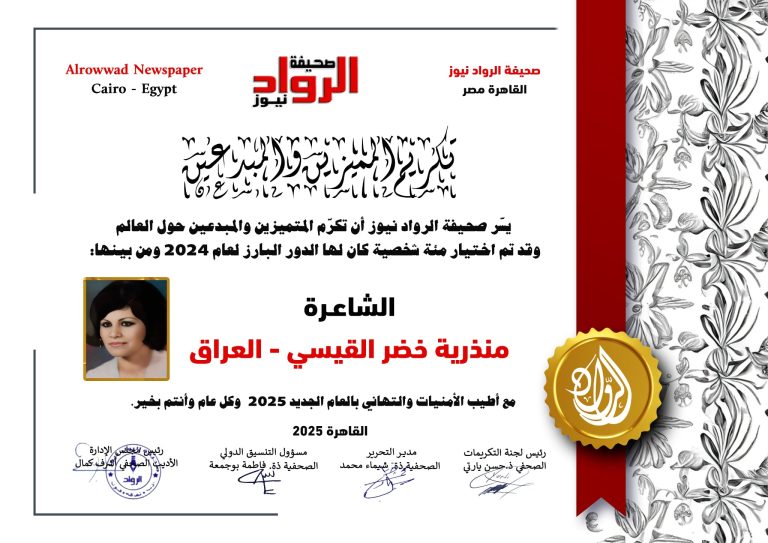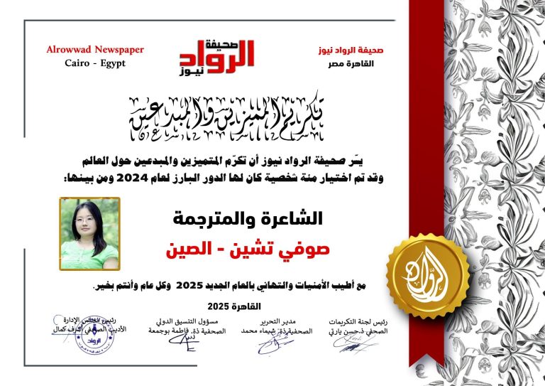 الرّواد نيوز تكرّم الشّاعرة والمترجمة: صوفي تشين..الصين صحيفة الرواد نيوز – alrouwadnews موسم ثقافيّ جديد حافلٌ وثريّ قريباً، صحيفة الروّاد بحلّة جديدة، نسخة ورقيّة وموقع إلكتروني بمواصفات عالميّة، أنشطة مهرجانات وملتقيات ثقافيّة ومشاركات دوّلية عبر العالم بأسره. لأنّ الرّيادة شعار…