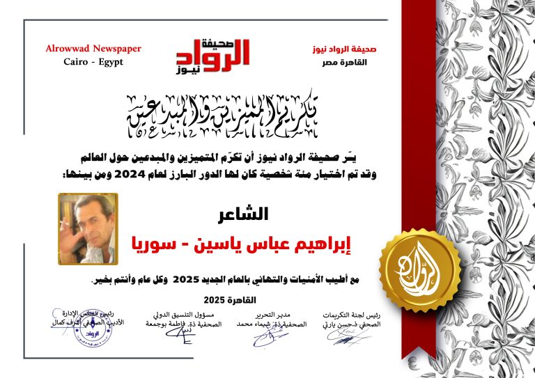 الرّواد نيوز تكرم الشّاعر : إبراهيم عباس ياسين..سوريا صحيفة الرواد نيوز – alrouwadnews موسم ثقافيّ جديد حافلٌ وثريّ قريباً، صحيفة الروّاد بحلّة جديدة، نسخة ورقيّة وموقع إلكتروني بمواصفات عالميّة، أنشطة مهرجانات وملتقيات ثقافيّة ومشاركات دوّلية عبر العالم بأسره. لأنّ…