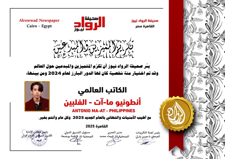 الرّواد نيوز تكرم الكاتب العالمي أنطونيو ما-آت …الفلبين صحيفة الرواد نيوز – alrouwadnews موسم ثقافيّ جديد حافلٌ وثريّ قريباً، صحيفة الروّاد بحلّة جديدة، نسخة ورقيّة وموقع إلكتروني بمواصفات عالميّة، أنشطة مهرجانات وملتقيات ثقافيّة ومشاركات دوّلية عبر العالم بأسره. لأنّ الرّيادة…