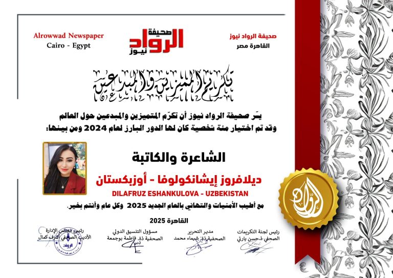 الرواد نيوز تكرم الكاتبة والشّاعرة : ديلافروز إيشانكولوفا..أوزبكستان صحيفة الرواد نيوز – alrouwadnews موسم ثقافيّ جديد حافلٌ وثريّ قريباً، صحيفة الروّاد بحلّة جديدة، نسخة ورقيّة وموقع إلكتروني بمواصفات عالميّة، أنشطة مهرجانات وملتقيات ثقافيّة ومشاركات دوّلية عبر العالم بأسره. لأنّ الرّيادة…