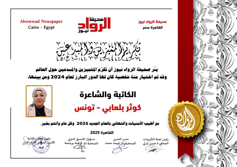 الرّواد نيوز تكرّم الكاتبالكاتبة  الشاعرة: كوثر بلعابي…تونس صحيفة الرواد نيوز – alrouwadnews موسم ثقافيّ جديد حافلٌ وثريّ قريباً، صحيفة الروّاد بحلّة جديدة، نسخة ورقيّة وموقع إلكتروني بمواصفات عالميّة، أنشطة مهرجانات وملتقيات ثقافيّة ومشاركات دوّلية عبر العالم بأسره. لأنّ الرّيادة شعار…