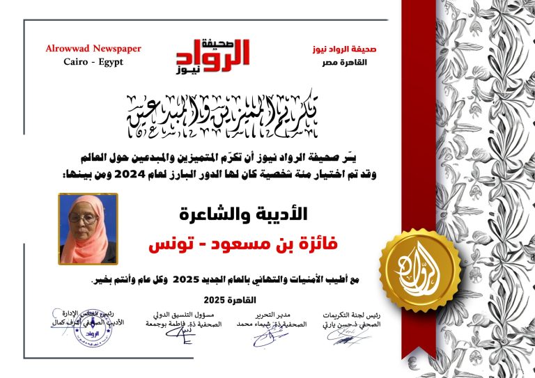 الرّواد نيوز تكرّم الأديبة والشّاعرة : فائزة بن مسعود…تونس صحيفة الرواد نيوز – alrouwadnews موسم ثقافيّ جديد حافلٌ وثريّ قريباً، صحيفة الروّاد بحلّة جديدة، نسخة ورقيّة وموقع إلكتروني بمواصفات عالميّة، أنشطة مهرجانات وملتقيات ثقافيّة ومشاركات دوّلية عبر العالم بأسره. لأنّ…