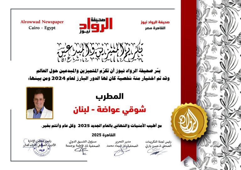 الرواد نيوز تكرم المطرب: شوقي عواضة …لبنان صحيفة الرواد نيوز – alrouwadnews موسم ثقافيّ جديد حافلٌ وثريّ قريباً، صحيفة الروّاد بحلّة جديدة، نسخة ورقيّة وموقع إلكتروني بمواصفات عالميّة، أنشطة مهرجانات وملتقيات ثقافيّة ومشاركات دوّلية عبر العالم بأسره. لأنّ الرّيادة شعار…