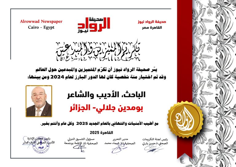الرّواد نيوز تكرّم الباحث الأديب والشّاعر: بومدين جلالي…الجزائر صحيفة الرواد نيوز – alrouwadnews موسم ثقافيّ جديد حافلٌ وثريّ قريباً، صحيفة الروّاد بحلّة جديدة، نسخة ورقيّة وموقع إلكتروني بمواصفات عالميّة، أنشطة مهرجانات وملتقيات ثقافيّة ومشاركات دوّلية عبر العالم بأسره. لأنّ الرّيادة…