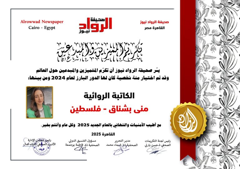 الرّواد نيوز تكرّم الكاتبة والرّوائية : منى بشناق…فلسطين صحيفة الرواد نيوز – alrouwadnews موسم ثقافيّ جديد حافلٌ وثريّ قريباً، صحيفة الروّاد بحلّة جديدة، نسخة ورقيّة وموقع إلكتروني بمواصفات عالميّة، أنشطة مهرجانات وملتقيات ثقافيّة ومشاركات دوّلية عبر العالم بأسره. لأنّ الرّيادة…