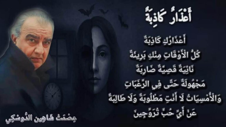 أَعْذَارٌ كَاذِبَةٌ … كتب … عِصْمَتْ شَاهِين الدُّوسْكِي كُلُّ الْأَعْذَارِ كَاذِبَةٌ فَلَا تُثَرْثِرْ بِكَلِمَاتٍ لَاهِبَةٍ لَسْتُ مِنْ أَوْلِيَّاتِكَ فَلَا تَحْسِبْ لِي ثَانِيَةً صَاخِبَةً كُنْ صَرِيحًا لَا تَكْذِبْ لَا تَهْرُبْ مِنْ حَقِيقَةٍ هَارِبَةٍ قُلْ مَا تُرِيدُ لَا تَتَرَدَّدْ فَالْمَشَاعِرُ…