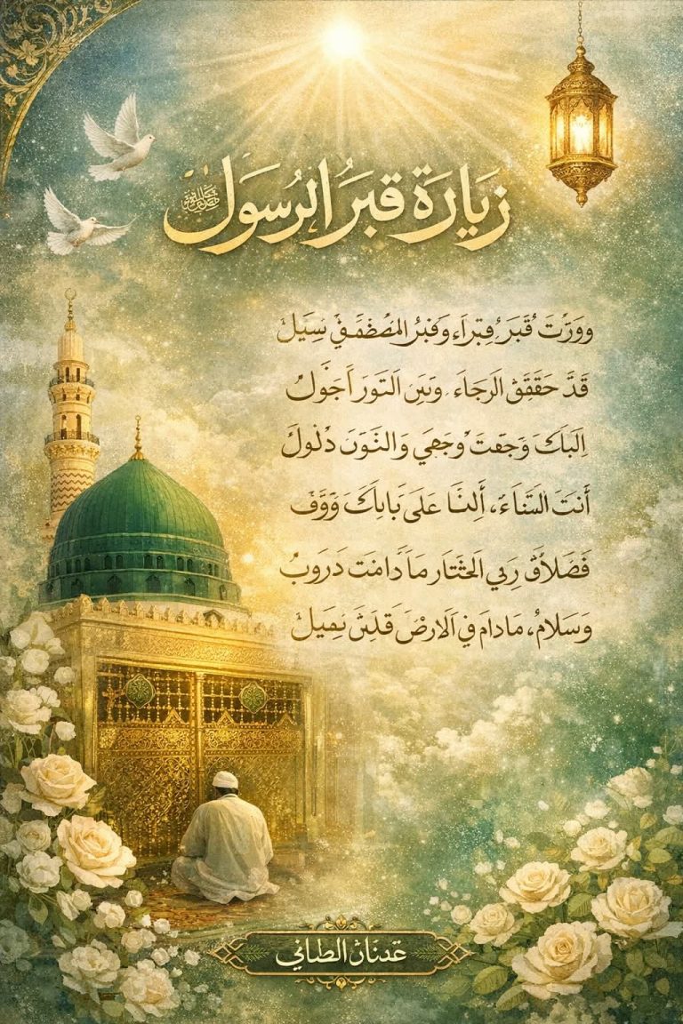 زيارةُ قبرِ الرّسول ﷺ سَلَكْتُ دَرْبًا، وَدَرْبُ العَاشِقِينَ طَوِيلُ وَزُرْتُ قَبْرًا، وَقَبْرُ المُصْطَفَى فَيْضٌ يَسِيلُ سَجَدْتُ لِلَّهِ شَاكِرًا، وَبِذِكْرِهِ أَقُولُ قَدْ حَقَّقَ الرَّجَاءَ، وَبَيْنَ النُّورِ أَجُولُ يَا لَيْتَ قَبْرِي دَنَا، وَرَحْمَتُهُ تَمِيلُ فَكُلُّ قُرْبٍ بِفَضْلِ اللَّهِ، َهْوَ الكَفِيلُ يَا خَيْرَ…
